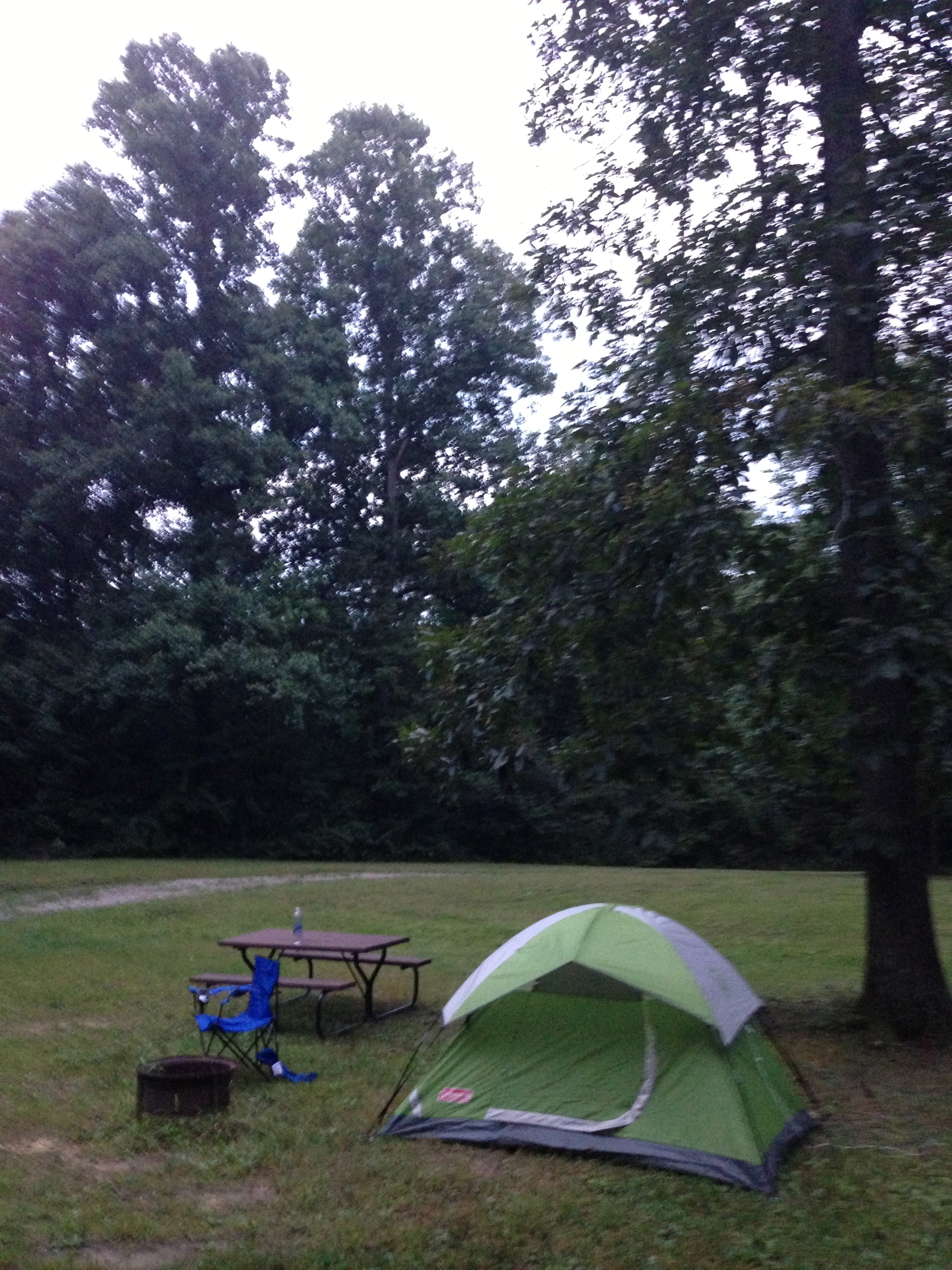 I drove through rural roads, with strange mix of traditionalism and commercialism on the roadside. This area, the Laurel Highlands, are popular for tourists in the summer – camping, rafting, hiking, etc. There were dozens of places that offered some form of entertainment or another, interspersed with open farmland and fields. I pulled into one campground and immediately regretted it. It looked like a carnival was going on. There no sites available anyway, so I moved on. I almost passed by a sign – “Hideway Campground” and immediately liked the sound of it. Pulling in, it was easy to see that this was everything the other place wasn’t – quiet, wooded, small. There were available sites and they only cost $16. A great bargain, and fantastic value. So, the first night of my road trip would be spent under the stars.